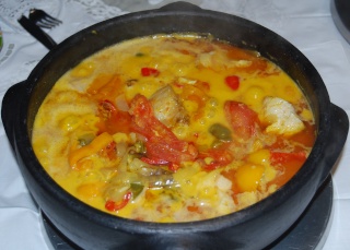 9.- Coloque as postas de bacalhau sem pele e sem espinhas na panela junto com o refogado de cebolas e pimentoes, no topo cubra com os tomates, deixe o fogo meio até que borbulhe levemente e os tomates desmanchen e formen um molho. Mantenha aquecido ate servir.