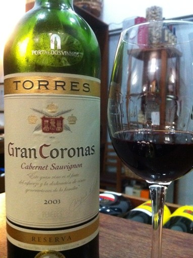 Hoje um Gran Coronas Cabernet Sauvignon Reserva 2003, produzido pela Torres na Espanha. Um vinho que impressiona, traz no nariz notas de café, licor de cassis, groselha, couro e mentol. Já na boca uma presença marcante de café torrado e cassis. Após um tempo na taça notas de caramelo no nariz e na boca. Um ótimo vinho!