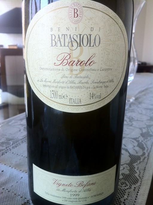 Neste último domingo provamos mais um grande vinho, o Batasiolo Barolo 1999. Proveniente dos vinhedos de Bofani em Monforte d´Alba no Piemonte, estava em garrafa magnum. Ao colocar na taça já apresentava evolução e uma cor caramelo clara. Na boca notas bem presentes de caramelo, um pouco de café e um final de frutas negras. Para completar estava elegante, leve e fácil de beber. Um vinho que teve boa evolução e ganhou com o tempo.