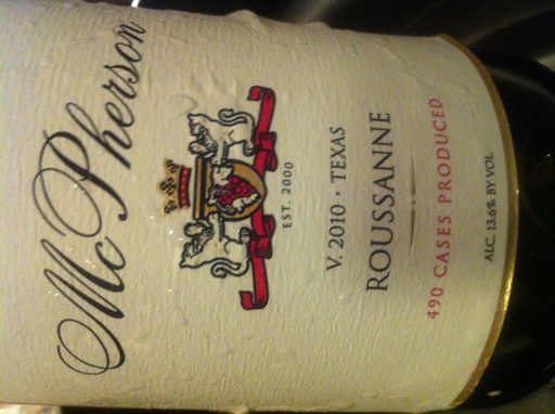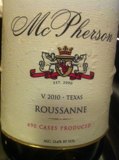 Mc Pherson 2010 Roussane, este vinho texano traz notas de mineral, fruta em compota, pêssego e mel. Tem baixa acidez, é leve, traz um toque adocicado e muito agradável na boca. Depois de um tempo seus aromas se convertem em puro maracujá.