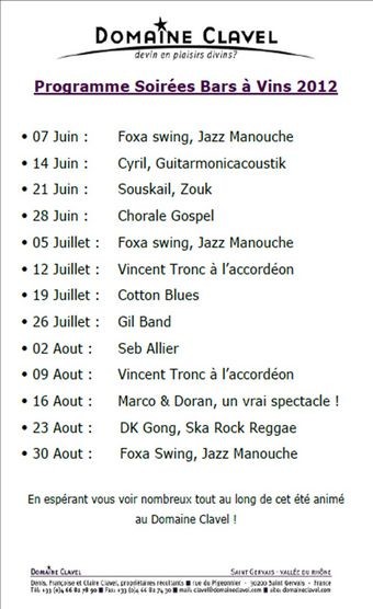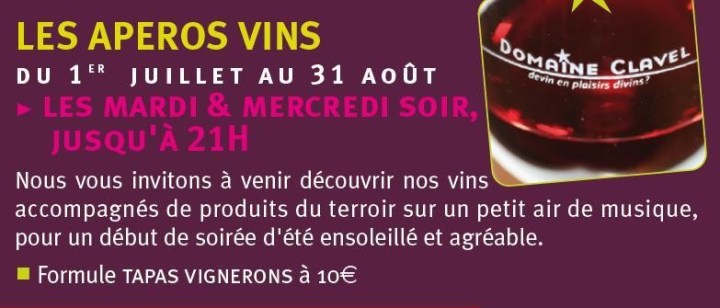 Apéros Vins : de 18h à 21h, avec les mardis Foxa Swing et son Jazz Manouche et les mercredis ce sera scène ouverte pour laisser place à un peu de diversité. Les Apéros Vins c’est aussi l’occasion pour vous de pouvoir démarrer vos soirées de manière sympathique et convivial : un verre de vin, quelques tapas, un brin de musique… Quoi de plus intimiste pour découvrir le Domaine Clavel autrement ?