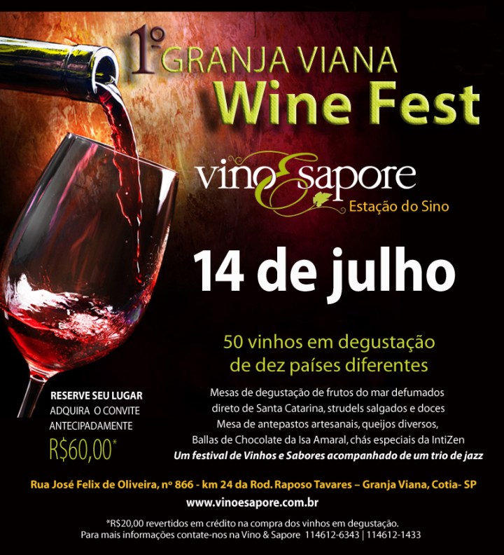 Neste sábado 14 de Julho das 14h as 21h, acontece o 1º Granja Viana Wine Fest na Vino & Sapore. Serão 100m² de área coberta anexa à loja com vinhos de 12 países: França, Argentina, Chile, Portugal, Itália, EUA, Espanha, Austrália, África do Sul, Uruguai, Líbano e Brasil. E não para por ai, os participantes poderão degustar uma diversidade de queijos, empanadas, antepastos, strudel, balas de chocolate e frutos do mar defumados. Claro tudo isso embalado por um trio de jazz tocando ao vivo.