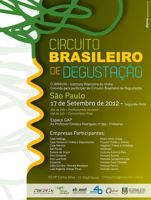 Mais uma vez será realizado em São Paulo o Circuito Brasileiro de Degustação 2012. Presença confirmada das principais vinícolas do país, este evento vem mostrar o que nossos produtores estão fazendo. Ano passado a Confraria dos Panas esteve lá (ver post).