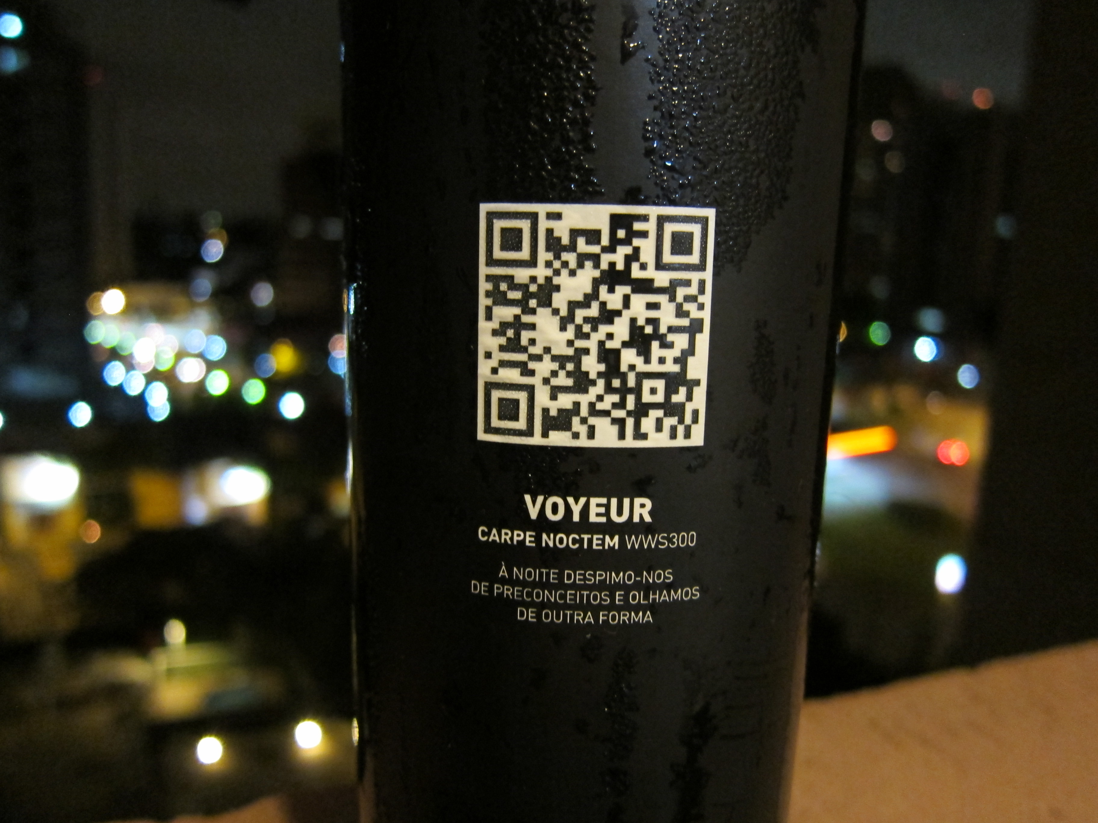 O segundo vinho da noite, o sugestivo voyeur. Um tinto elaborado com as uvas Castelão (48%), Touriga Nacional (28%) e Touriga Franca (24%). Apresenta notas muito presentes de café, especiaria e uma azeitona preta bem marcante. Na boca é igual, porém apresenta um teor alcoólico elevado apesar de ter 13%. Bom corpo, leve e no final de boca pimenta. Um vinho jovem que eu provaria com churrasco. Preço ao consumidor acima de R$100,00.