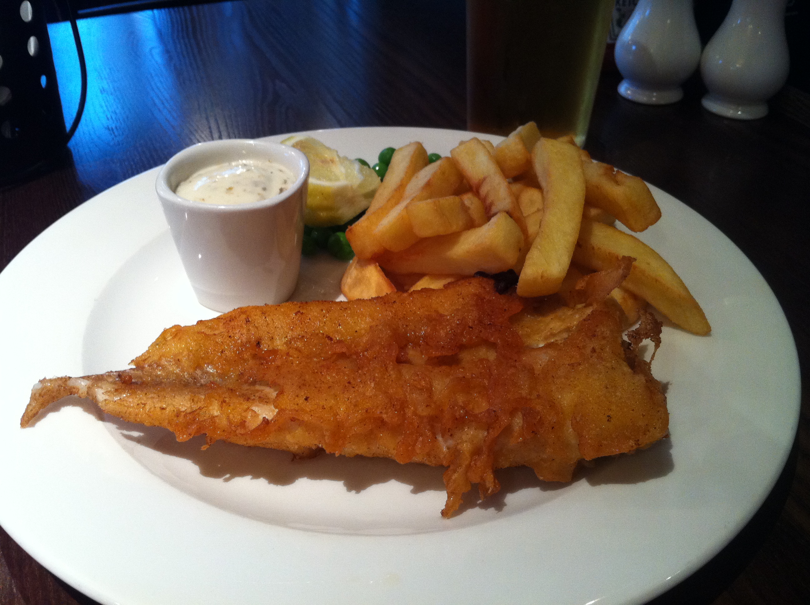 Batata frita no ponto certo, pasta de ervilha boa, mas o peixe com muito óleo.