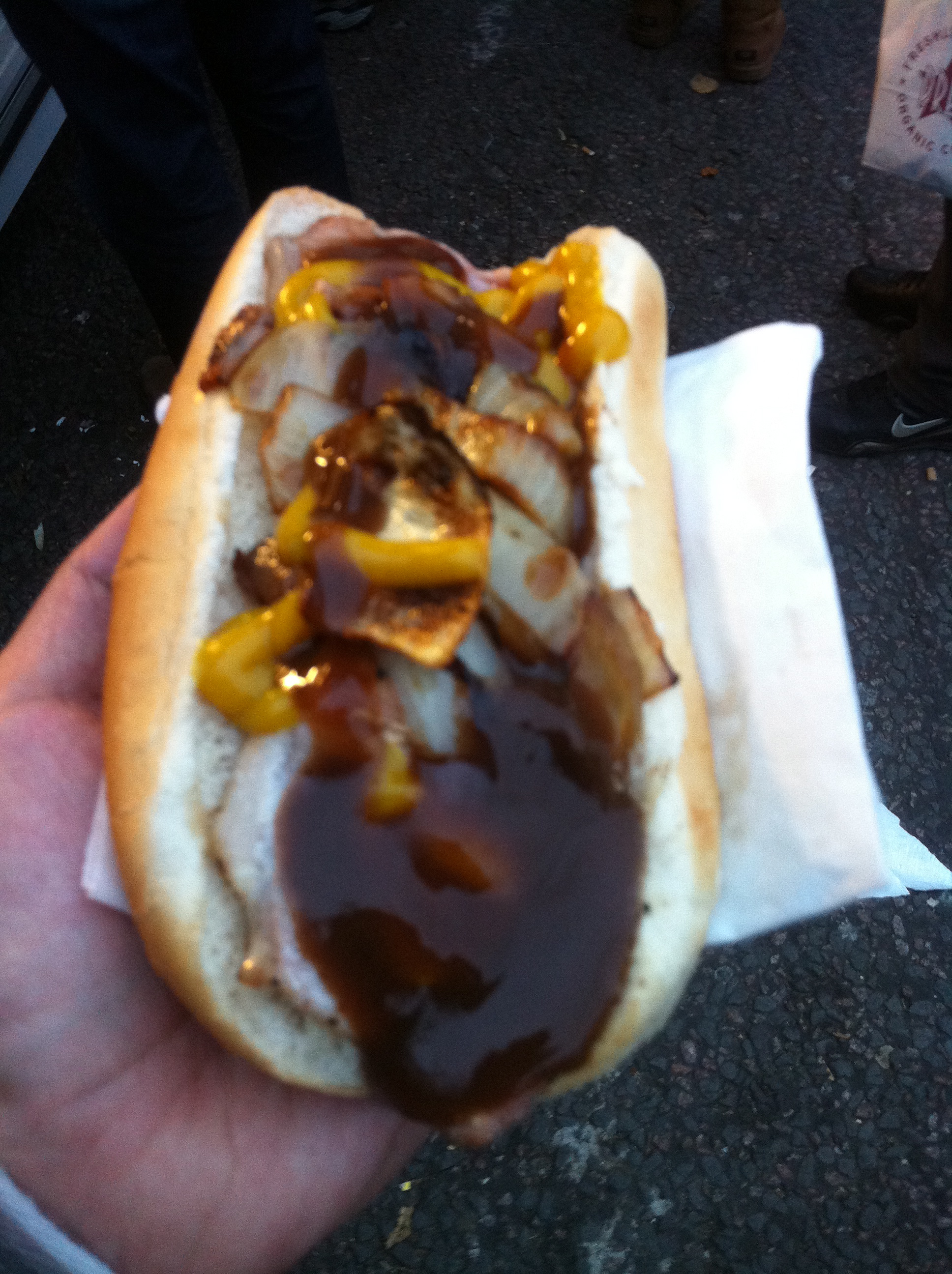 Uma maravilha da comida de rua, é de dar água na boca. Um sanduíche simples de panceta com molho barbecue, mostarda e bastante cebola. Se não fosse ainda assistir ao jogo, comeria mais dois facilmente. Uma delícia!