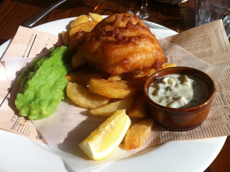 Pedi o famoso prato inglês, fish and chips. Todos os ingredientes frescos e fritos na medida certa. Para completar, um capricho fora do normal, o peixe vem em uma imitação de folha de jornal, remetendo as origens do prato.