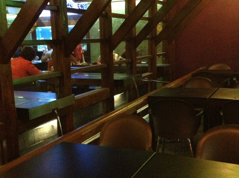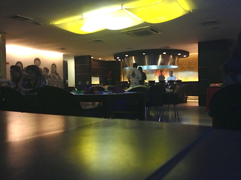 O lugar é muito bonito e chama a atenção, tem um pequeno “aquário” no chão com carpas, que passa entre as mesas.