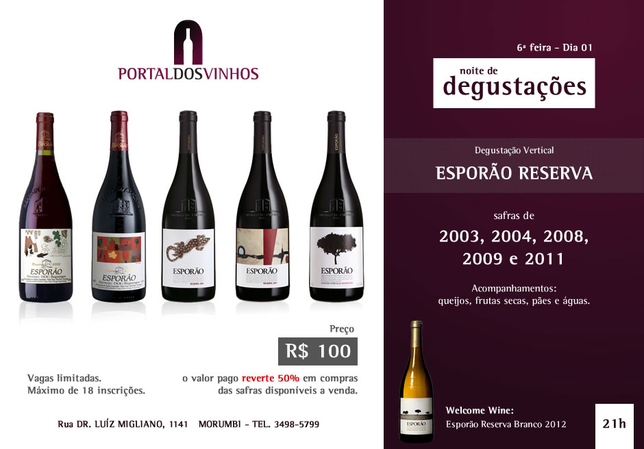 Degustações Degustação Vertical ESPORÃO RESERVA Na próxima sexta-feira dia 01/08, na Portal dos Vinhos no Morumbi haverá uma degustação de Esporão Reserva. Mais informações: Descubra mais sobre Confraria dos Panas Assine para receber nossas notícias mais recentes por e-mail. Digite seu e-mail… Assinar Compartilhe isso: Clique para compartilhar no WhatsApp(abre em nova janela) WhatsApp Tweet Clique para enviar um link por e-mail para um amigo(abre em nova janela) E-mail MaisCompartilhar no TumblrCurtir Carregando... Relacionado