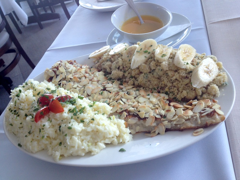 Optamos por um dos carros chefe da casa, um Abadejo grelhado com lascas de amêndoas, risoto de alho poró e farofa de banana.