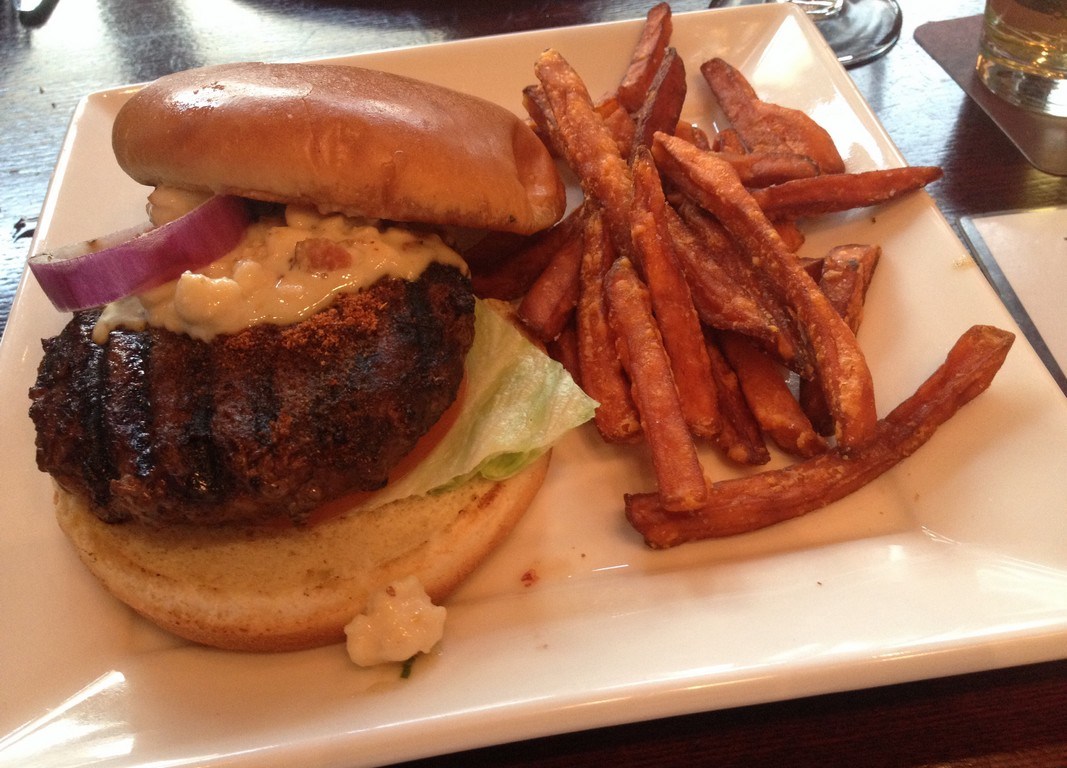 Para matar a fome, um Kobe black & bleu. Um hambúrguer de Kobe, molho de queijo bleu, cebola roxa, alface e tomate.