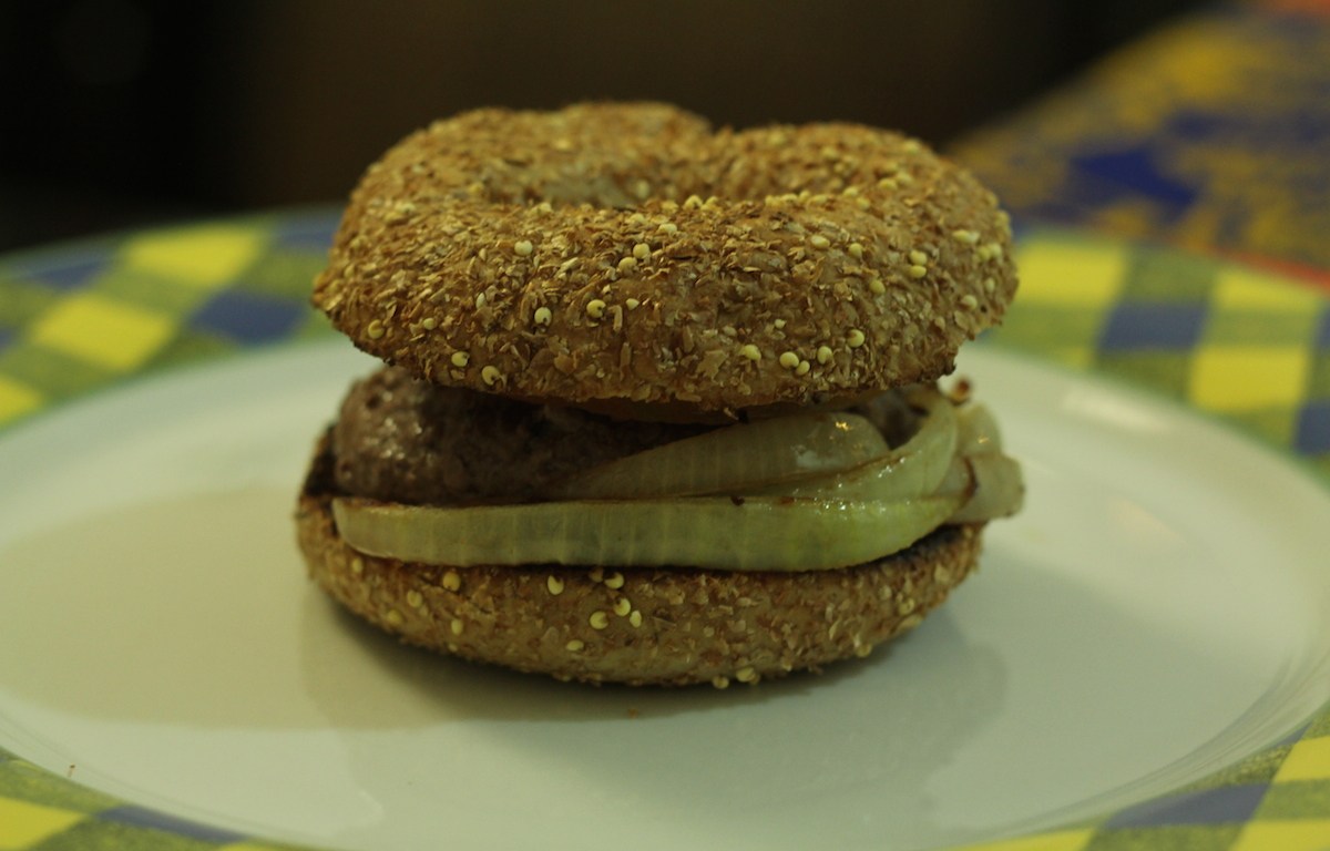 Numa ida ao empório de um amigo, descobri um pão que poderia ser ideal para o meu hambúrguer, o Bagel integral.