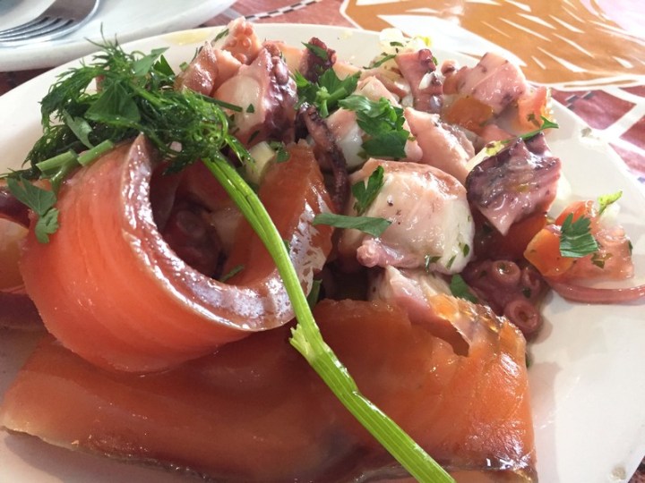 Há algumas boas opções para comer por quilo, como a lula e o salmão defumado por exemplo.