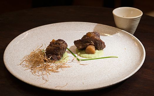 Prato principal – Cupim com osso de pupunha ao molho jus e purê de alho-poró