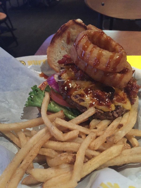 Pedi um delicioso Big Jack Daddy Burger, com carne de porco desfiada, anéis de cebola crocante, queijo cheddar jack, molho da casa, alface, tomates, picles e cebolas vermelhas.