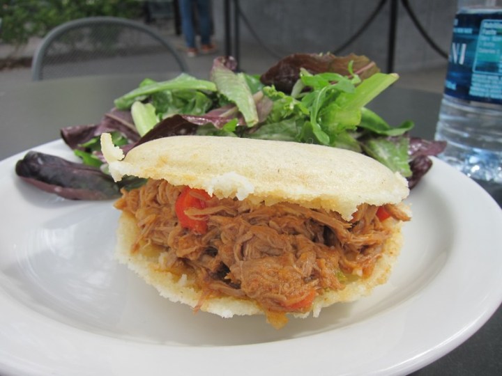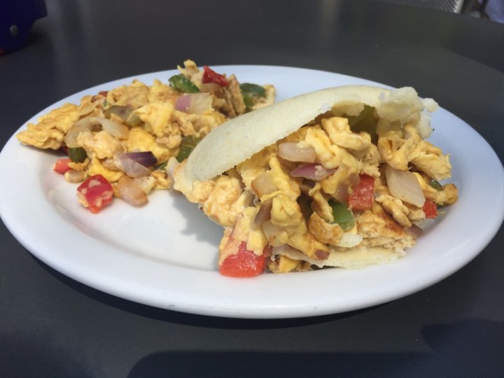 Passei pela chamada Breakfast Arepa, uma adaptação para uma arepa recheada com ovos e queijo gouda.