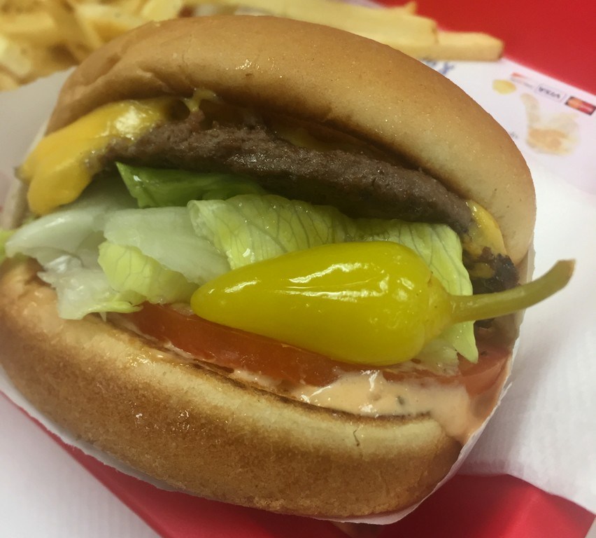 Visitei a loja de Mountain View, na Califórnia, e provei mais uma vez o cheesebúrguer. Fui na seção de molhos, peguei uma pimenta Jalapeño e coloquei dentro. Ficou uma delícia.