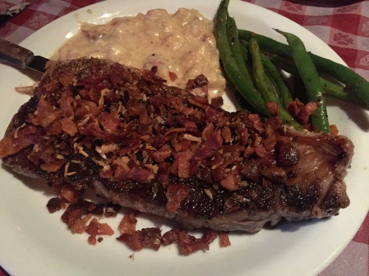 Pedimos o Bacon Crusted Pepper Steak (Steak au poivre). Um belo pedaço de carne com muita pimenta e muito bacon.