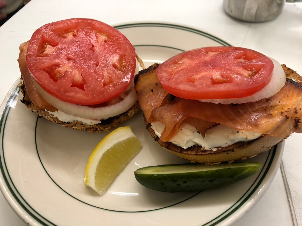 A opção foi escolher cada tipo em separado e depois pedir o famoso sanduíche, com salmão defumado a sua escolha, pão Bagel torrado, tomate, cebola alcaparra, cream cheese e picles. Comeria uns 10 se fosse possível, tanto que voltei outro dia para comer mais.